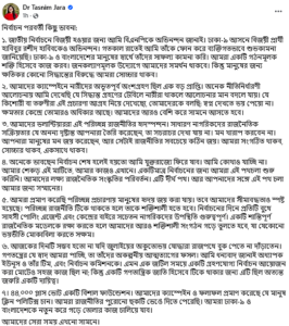 পোস্টে নির্বাচনী প্রচারণায় নারীদের সক্রিয় অংশগ্রহণকে বড় অর্জন হিসেবে তুলে ধরেন তাসনিম জারা। তাঁর ভাষায়, সিদ্ধান্ত গ্রহণের টেবিলে নারীদের উপস্থিতি আলোচনার মান ও দৃষ্টিভঙ্গিতে ইতিবাচক পরিবর্তন আনে।