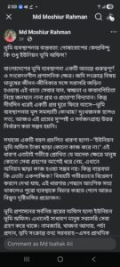 স্ট্যাটাসের শেষাংশে তিনি বলেন, দোষারোপ নয়—সমন্বিত উদ্যোগ ও কাঠামোগত সংস্কারই হতে পারে ভূমি ব্যবস্থাপনার স্থায়ী সমাধান। প্রতিটি স্তরে স্বচ্ছতা নিশ্চিত করা, ডিজিটাল সেবা সম্প্রসারণ, পর্যাপ্ত জনবল নিয়োগ এবং কার্যকর তদারকি ব্যবস্থা গড়ে তোলার মাধ্যমে ভূমি প্রশাসনকে আরও জনবান্ধব করা সম্ভব বলে তিনি মত দেন।