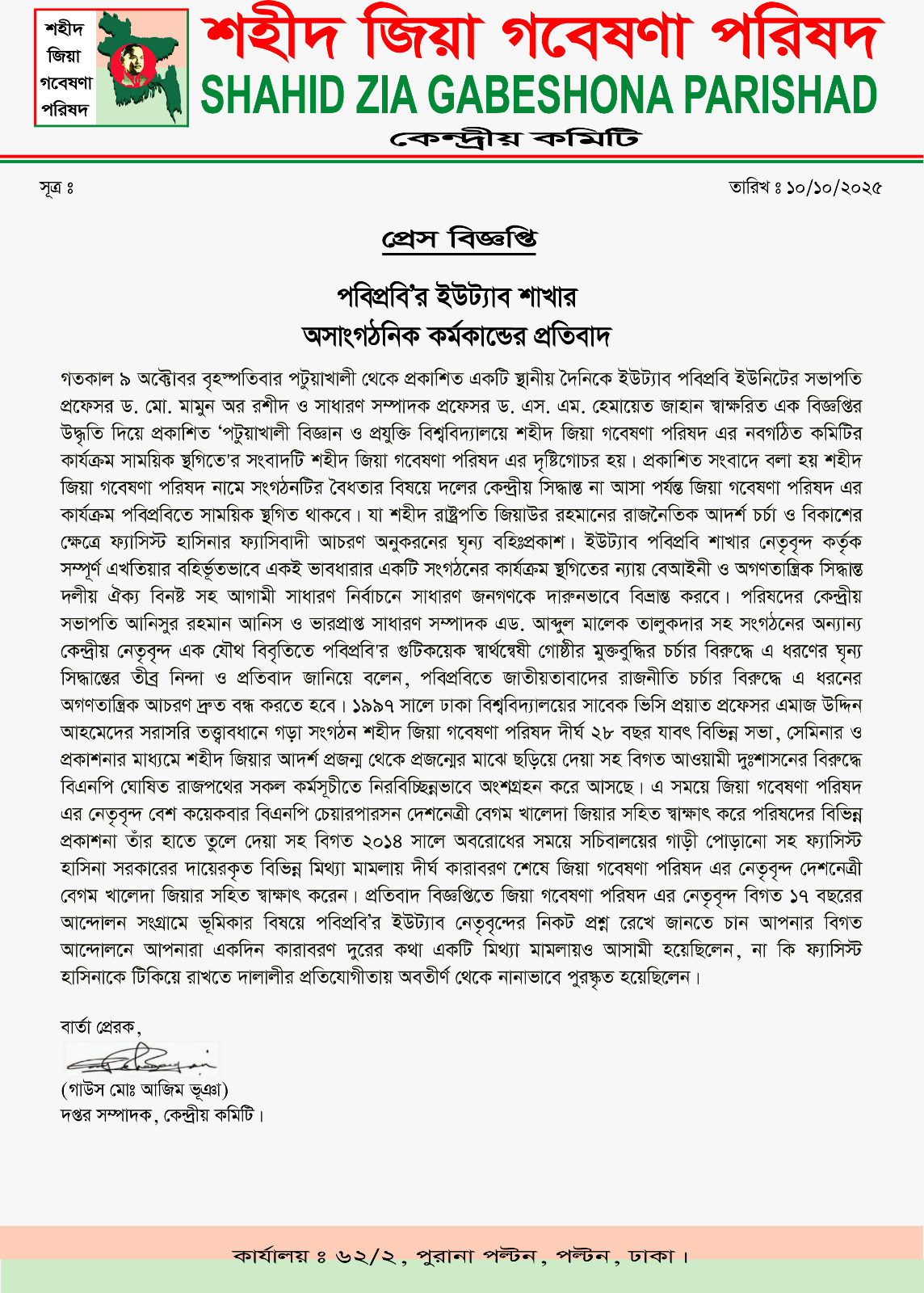 পটুয়াখালী ভার্সিটির, ইউট্যাব শাখার সাংগঠনিক সিদ্ধান্তের প্রতিবাদে শহীদ জিয়া গবেষণা পরিষদের নিন্দা