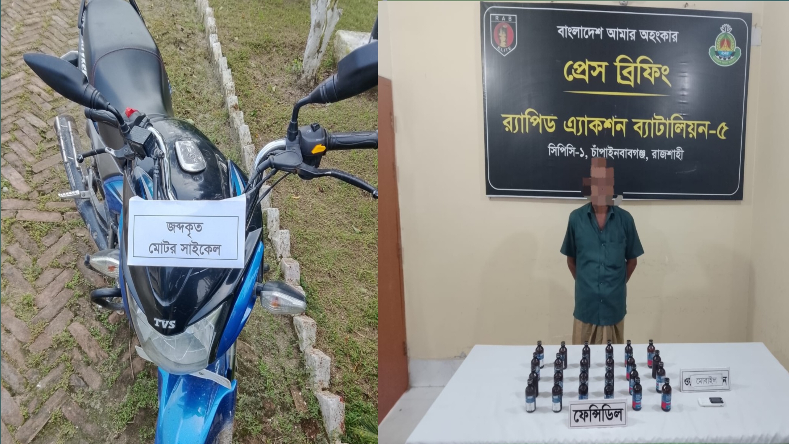 অভিনব কায়দায় মোটরসাইকেলে ফেনসিডিল বহনকালে একজন গ্রেফতার