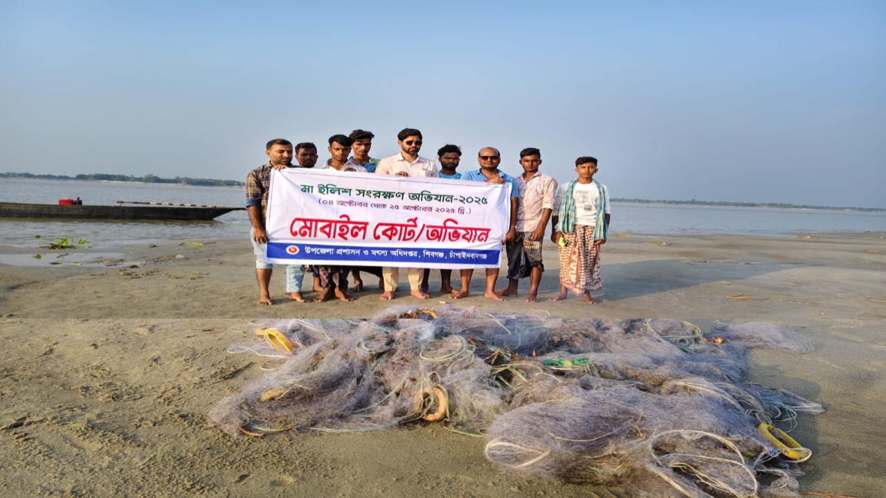 শিবগঞ্জে পদ্মা নদীতে মা ইলিশ সংরক্ষণ অভিযানে কারেন্ট জাল পুড়িয়ে বিনষ্ট করেন সঞ্জয় কুমার সরকার