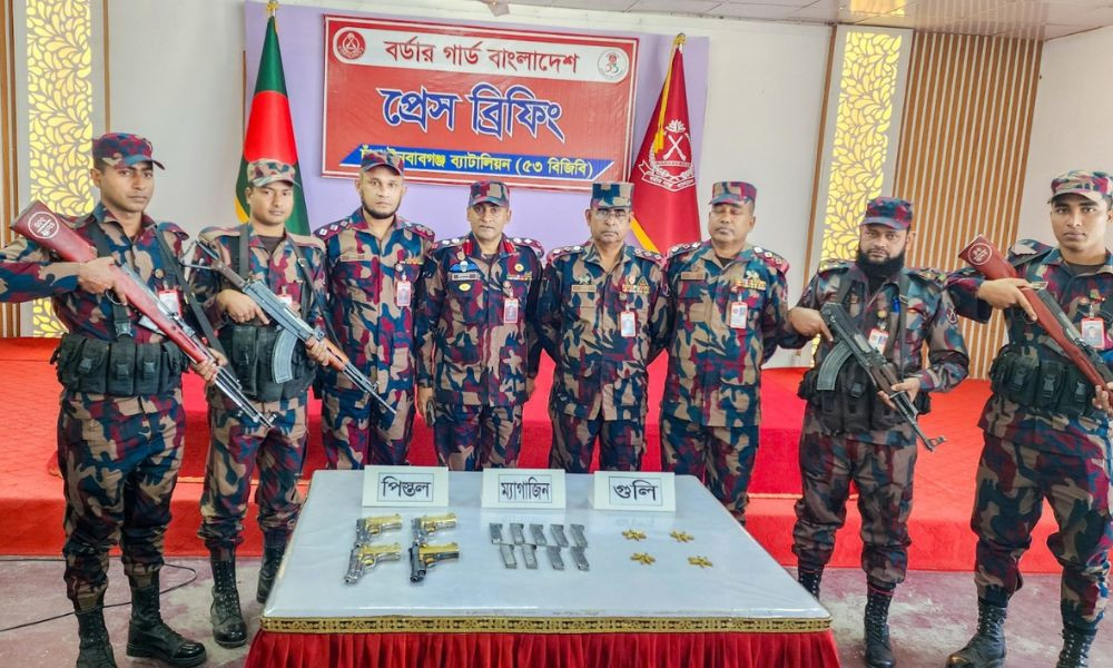 চাঁপাইনবাবগঞ্জের শিবগঞ্জ উপজেলার মনোহরপুর সীমান্তে বিজিবির অভিযান চলাকালে চারটি আমেরিকান পিস্তল, ২৪ রাউন্ড গুলি এবং ৯টি ম্যাগাজিন উদ্ধার করা হয়েছে।