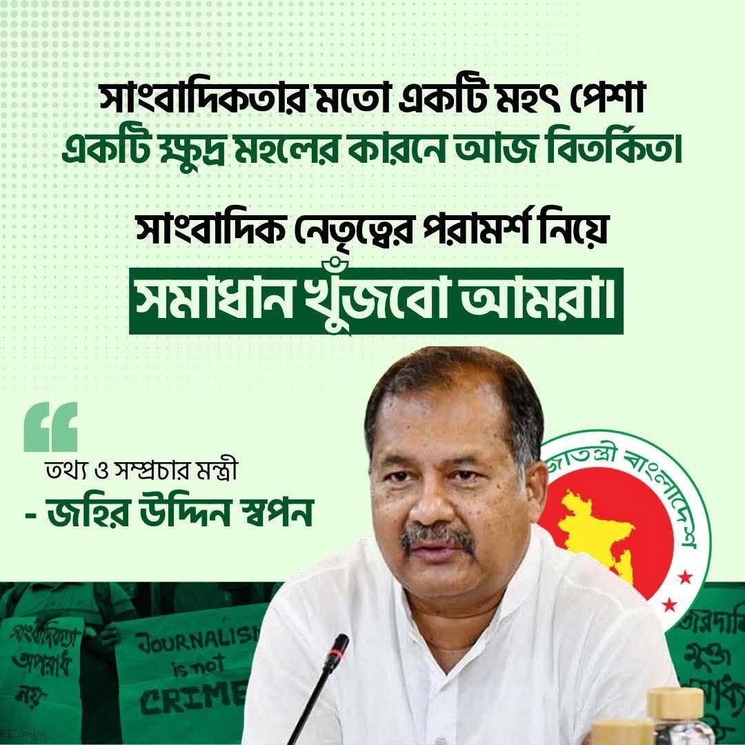 সাম্প্রতিক সময়ে সাংবাদিকতা পেশাকে ঘিরে চলমান বিতর্কের মধ্যে গুরুত্বপূর্ণ মন্তব্য করেছেন তথ্য ও সম্প্রচার মন্ত্রী জহির উদ্দিন স্বপন। তিনি বলেছেন,