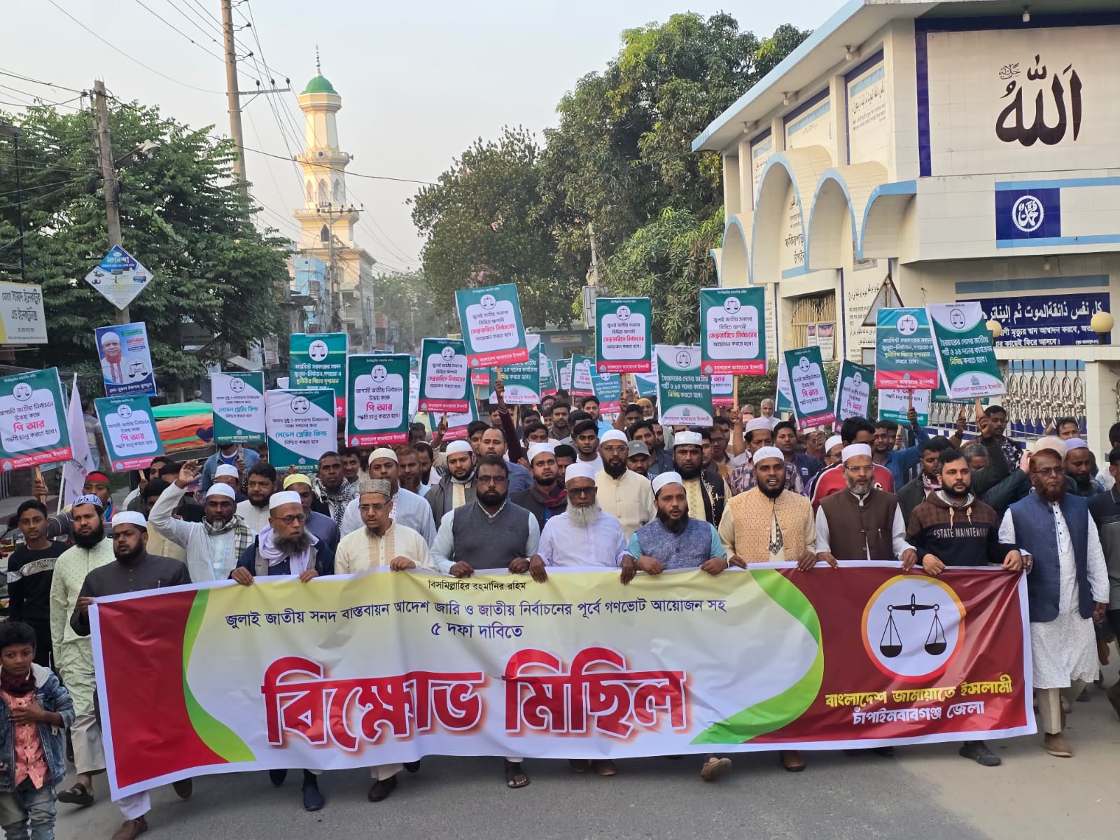 জুলাই জাতীয় সনদ বাস্তবায়ন, জাতীয় নির্বাচনের পূর্বে গণভোট আয়োজনসহ পাঁচ দফা দাবিতে চাঁপাইনবাবগঞ্জে বৃহদায়তন বিক্ষোভ মিছিল করেছে বাংলাদেশ জামায়াতে ইসলামী