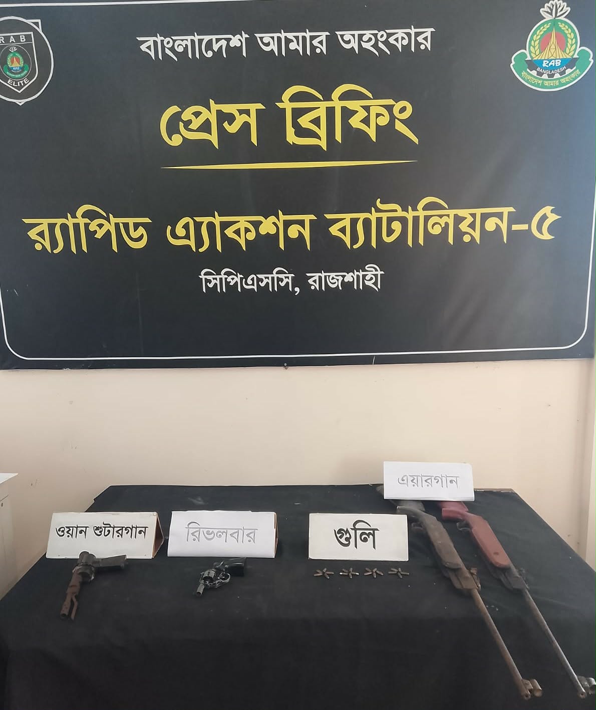 রাজশাহী মহানগরীর শাহমখদুম থানার পুরাতন ফুদকিপাড়া এলাকায় গভীর রাতে বিশেষ অভিযান চালিয়ে একটি বিদেশি রিভলবার, একটি ওয়ান শুটারগান, দুটি এয়ারগান